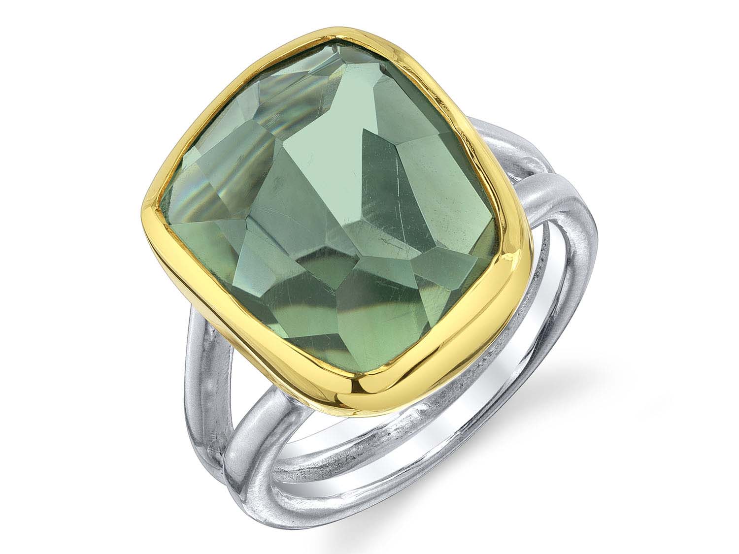 THE DETAILS: Bezel Set Green Amethyst Ring in 18K Yellow Gold and Sterling Silver