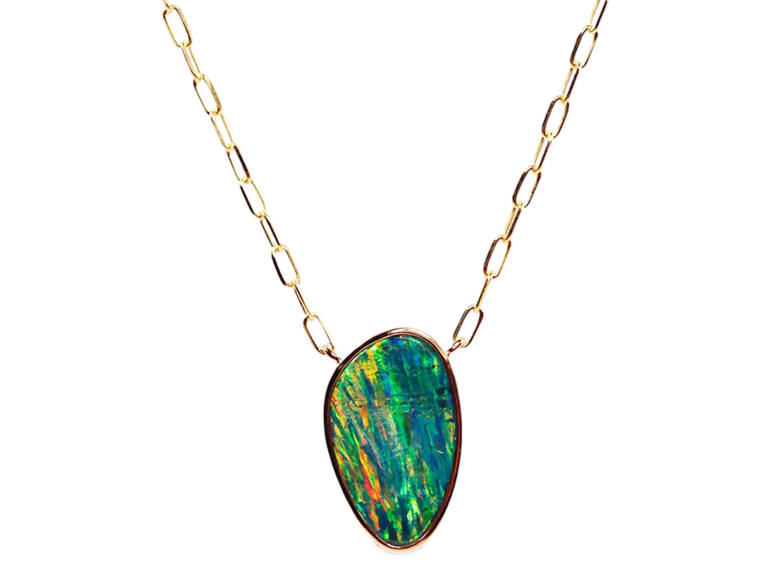 - Pendant features one bezel set freeform oval-shaped opal doublet having a strong play-of-color with flashes of green, blue, orange and yellow