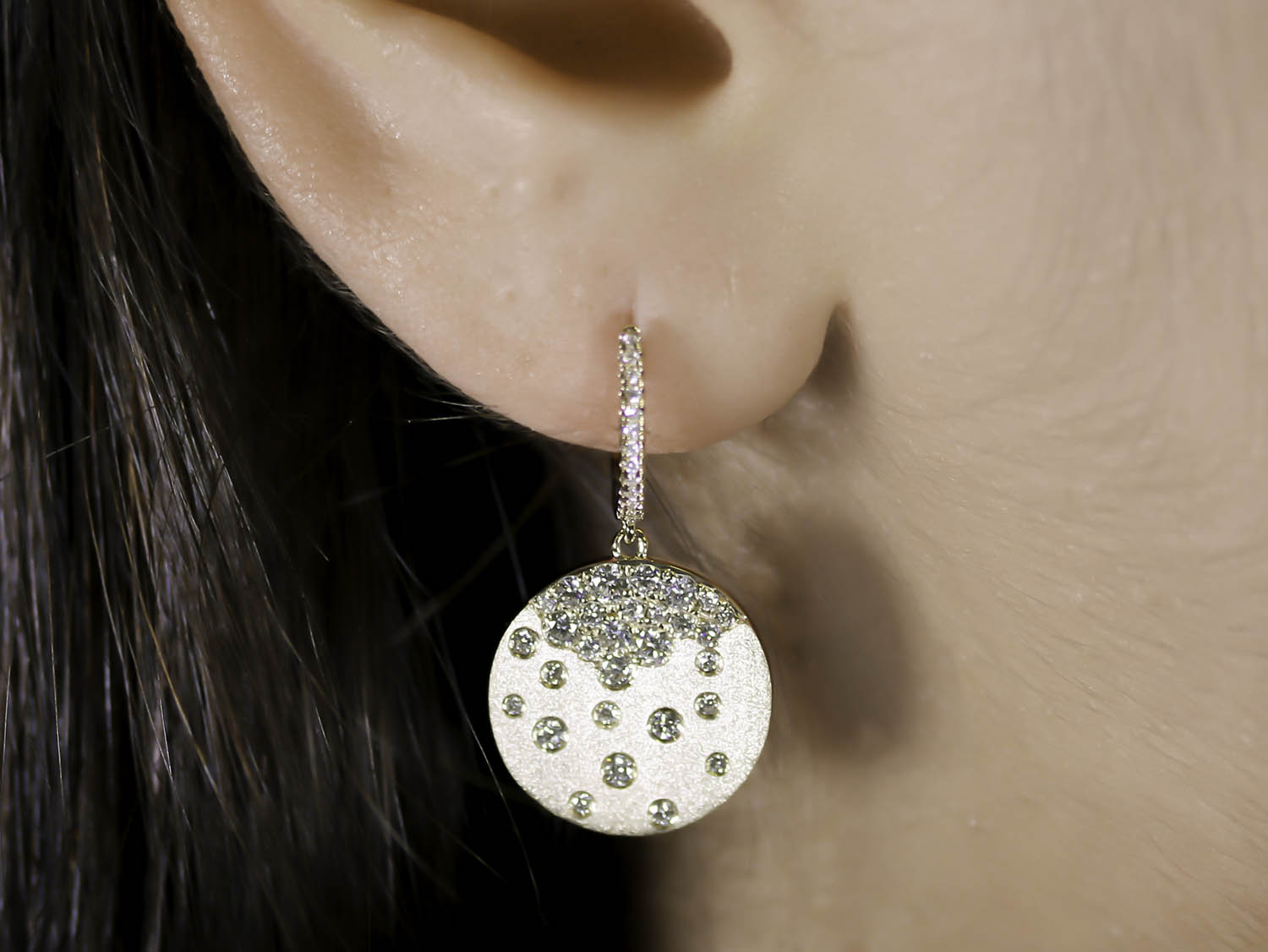 Diamond discs dangle from hoop earrings