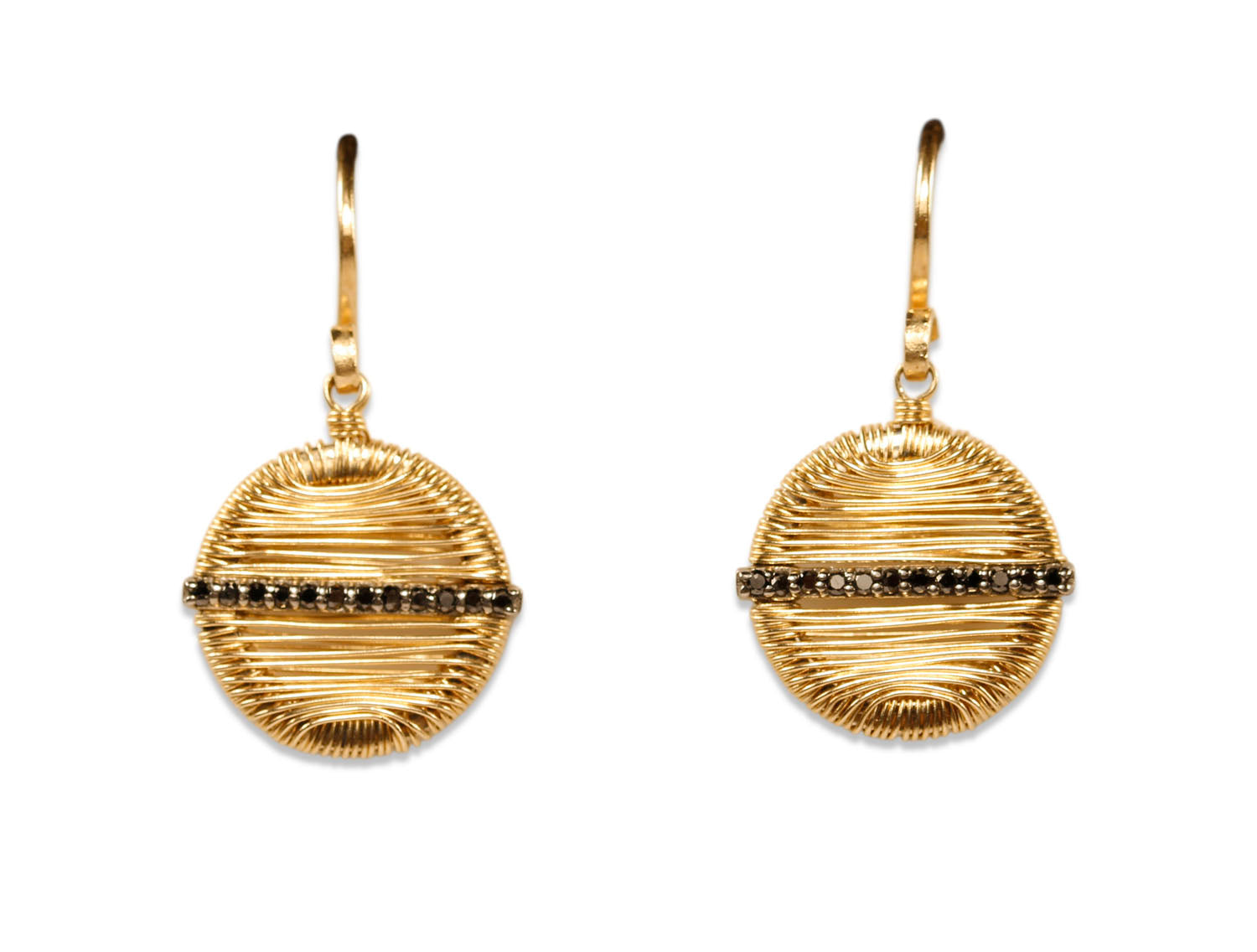 Black Diamond and Gold Wire-Wrapped Disc Earrings