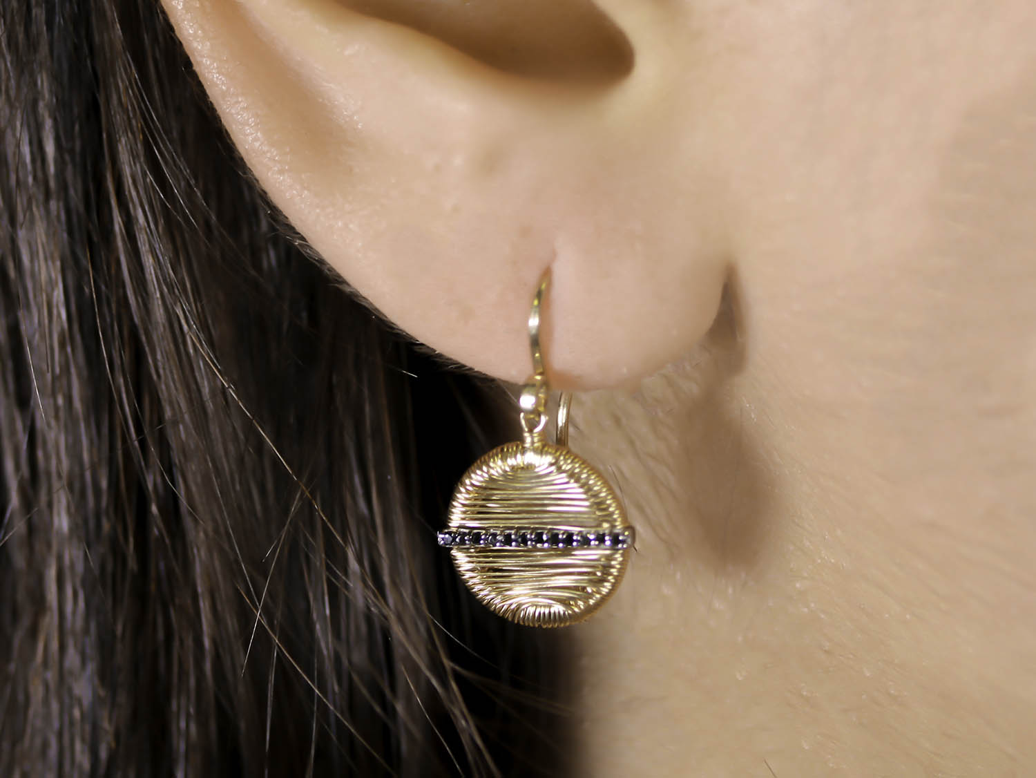 Each earring features one gold wire-wrapped disc with a channel of black diamonds
