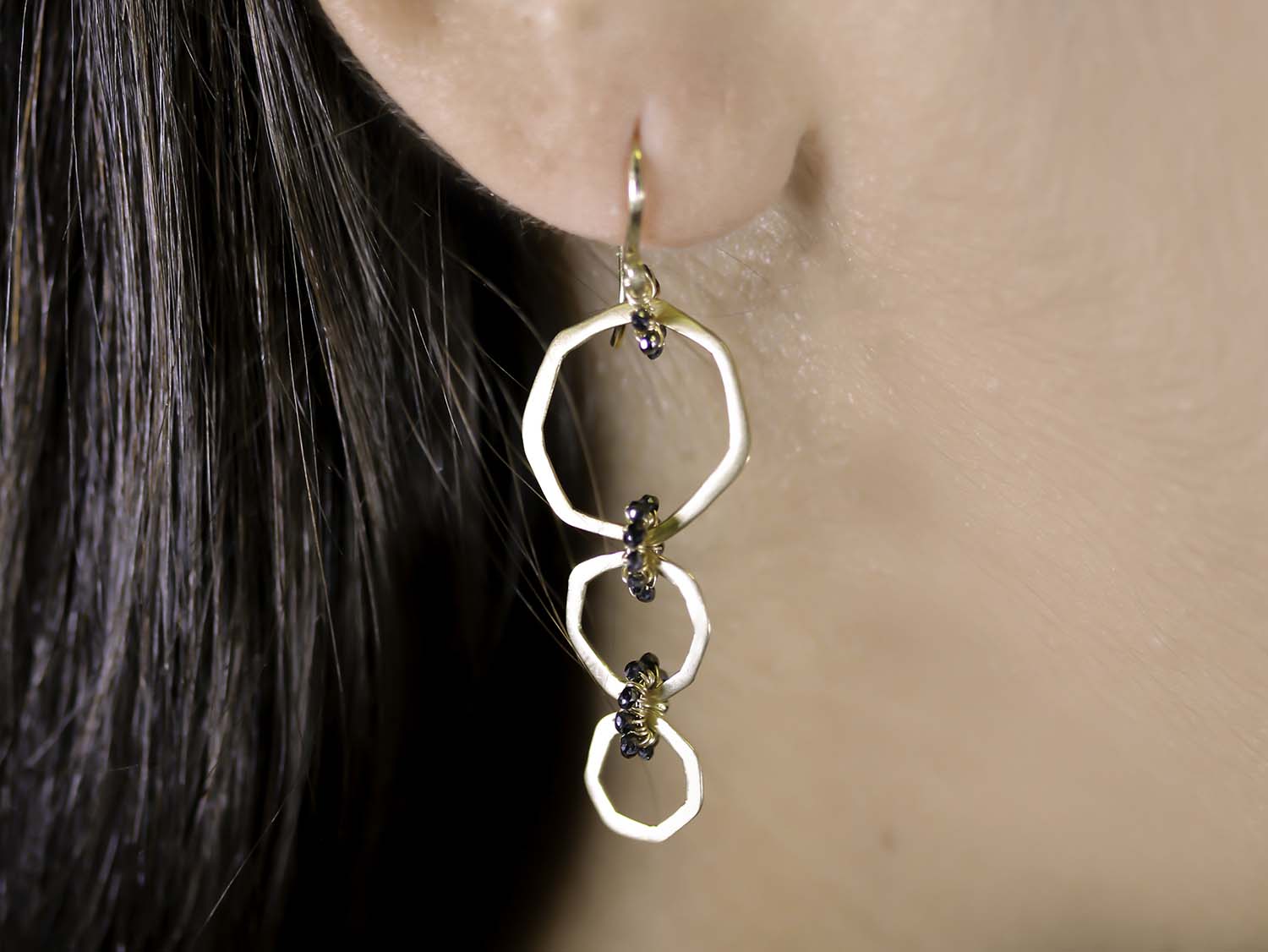 - Each earring features three circle elements connected by black diamond sections