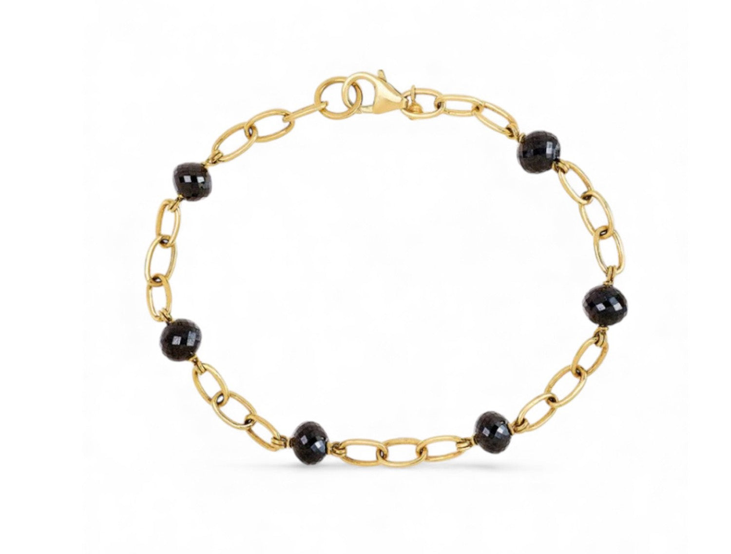 Glossy faceted black diamond beads orbit along solid 18K gold oval links